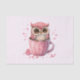 Papier de tissus avec l'adorable image d'un hibou assis dans une tasse de café. Des coeurs se balançant et un seul rose placé au fond de la tasse.