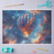 "Cosmic Balloon Adventure" Cette image vibrante et colorée présente une montgolfière flottant au milieu d'un ciel cosmique rempli d'étoiles, de nébuleuses et de nuages. Le ballon est modelé avec plusieurs couleurs comme le bleu, le rouge, l'orange et le jaune. En dessous du ballon se trouve un tourbillon de nuages brillants, suggérant un voyage autrement mondain ou onirique. Un croissant de lune est visible dans le coin supérieur gauche contre l'arrière - plan de l'espace bleu profond. Ce mélange de montgolfière traditionnelle et de fond cosmique surréaliste crée un sentiment d'aventure et d'imaginaire, captant l'imagination.