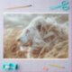 Regal White Majesty L'image capture la présence impressionnante d'un majestueux lion blanc, sa crinière épaisse et flottante brillant au soleil. Sur fond d’herbe dorée et haute, le regard du lion se dirige vers le côté, dégageant une aura royale et contemplative. Cette magnifique créature incarne l’essence de la force, de la noblesse et de la grâce, en tant que symbole puissant de la beauté sauvage intacte.