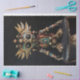 Le robot présente une fusion d'éléments mécaniques et artistiques, puisant son inspiration dans les traditions artistiques africaines. Il est décoré de motifs complexes et de décorations dans une palette d'or, de turquoise, de rouge et d'autres couleurs vives. La tête du robot est un trait distinctif, avec de grands yeux captivants et des éléments décoratifs qui rayonnent vers l’extérieur, rappelant une coiffure cérémonielle. Les bras et les mains mécaniques sont également décorés de manière complexe, faisant écho à l'artisanat détaillé de la conception globale. Placé sur un fond sombre, le robot est exposé sur une table qui reflète son esthétique élaborée, mettant l'accent sur l'unité de l'art et de la technologie.