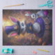 L'image représente une scène lunatique et imaginaire avec deux lapins anthropomorphes. Le lapin central est habillé d'un habit de style victorien élaboré avec une robe violette, un tablier blanc et un grand chapeau orné d'une horloge. Ce lapin tient une montre de poche. Le deuxième lapin, plus petit et blanc, se tient sur ses pattes arrières et semble interagir avec le lapin central. L'arrière - plan est une forêt magique avec des champignons surdimensionnés, des lanternes brillantes et une atmosphère enchanteresse générale. L'image rappelle la blonde et ses thèmes lapins, avec son portrait détaillé et imaginatif d'un monde fantastique. lapins lunaires, lapin victorien, scène d'imaginaire, forêt magique, animaux anthropomorphes, Alice Adventures thème, champignons surdimensionnés, lanternes brillantes, atmosphère enchanteresse, RHDesigns par 2chattychicks.