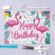Célébrez en style avec notre design d'anniversaire tropical amusant avec des illustrations de flamants amusantes! Cette oeuvre d'art dynamique et préconçue apporte une touche de paradis tropical à toute fête avec des couleurs vives, des feuilles de palmiers et des flamants gais.