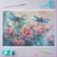 Une scène fantaisiste et onirique où se croisent deux grandes libellules qui surplombent une délicate rose. Les libellules ont des ailes allongées et translucides avec des motifs bleus complexes ressemblant à des vitraux. Leurs corps sont segmentés et ornés de rayures bleues et dorées.