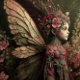 Une fée drapée de pétales douces et roses et d'ailes chatoyantes. Sa tenue brille comme si elle était éclairée par un doux clair de lune, évoquant un sentiment de sérénité et d'enchantement nocturne. Idéal pour une décoration vintage ou un peu défraîchie.
