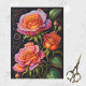 Sur un arrière - plan noir, l'oeuvre arbore un spray de roses orange et roses.