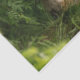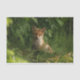 Papier de tissus avec une photo montrant un mignon petit renard à fourrure rouge et blanche. Entouré de feuilles et d'herbes verdoyants.
