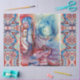 Coloré, fantaisiste, romantique, symboliste peinture figurative contemporaine aquarelle pour une figure spirituelle mystique de légende en bleu, rose, rouge, violet, couleurs blanches par Alessandro Lumini 1988.
