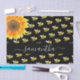 Décoré d'abeilles jaunes et noires souriantes et joyeuses et d'un grand tournesol aquarellé. Un arrière - plan noir chic. Personnalisez et ajoutez un nom. Le nom est écrit avec un script de style moderne écrit à la main avec des swashes. Pour que les swashes ne suppriment que le nom de l'échantillon, laissez les espaces ou émoticônes devant et après le nom.