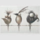 Voici le Stark Perch Trio, un groupe de trois oiseaux stylisés perchés sur un fil, chacun avec ses propres caractéristiques uniques et exagérées : Spiky Feather Bird : L'oiseau à gauche a de longues plumes pointues qui s'échappent de sa tête et de sa queue, ressemblant à une explosion de lignes, lui donnant une apparence dramatique et pointue. Striped Surprise Bird : L'oiseau moyen est mince avec des rayures verticales et des touffes de plumes qui s'accrochent au sommet de sa tête, ce qui lui donne un air surpris et décalé. Oiseau comique : L'oiseau à droite est recouvert de grands yeux ronds et d'un petit bec, ce qui lui donne une expression quelque peu comique et attachante. Placés contre un simple arrière - plan, les traits grossiers et exagérés de ces oiseaux créent une scène visuellement saisissante et fantaisiste.