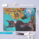 Chat noir expressif, capricieux, tournesols colorés et feuilles verts dans les couleurs jaune et bleu turquoise. Peinture acrylique originale artistique et vibrante sur panneau en bois par Bulgan Lumini (c)