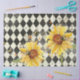 PANNEAU DE DROITE POUR TISSEURS OU CABINETS. "Tournesol avec abeilles, Arlequin Noir en Crème Ephémère Découpage en Bois, papier de tissu lourd pour l'artisanat et la décoration de meubles." Des tournesols rustiques et élégants avec des abeilles bosselées et feuillage feuillu sur un motif en diamant noir et crème Harlequin qui a été affligé. Un crépis blanc doux peint en bois rustique arrière - plan et écriture éphémère script à la main finissent le design. Peinte en aquarelle et dessinée graphiquement par Audrey Jeanne Roberts, artiste et designer de renommée internationale, copyright.