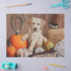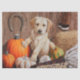 Un chiot de récupération du Labrador jaune se trouve parmi une récolte d'automne de citrouilles, de gourdes, de maïs indien et d'une balle de foin. Et le mur de la grange en bois de l'arrière - plan est décoré d'un vieux fer à cheval rouillé et de plumes de dinde. OEuvre d'art réaliste créée à partir d'une peinture à l'huile originale de l'artiste animalière Crista S. Forest.
