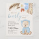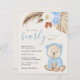 Boho petit garçon à petit budget invitation à la douche avec une aquarelle d'un ours en peluche mignon, un bouquet de taupe, bleu et terre cuite pampas herbe et fleurs et "We Can Bearly Wait" dans un mélange de typographie simple et d'un élégant script bleu swash.