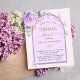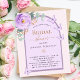 Arrière - plan de couleur pêche avec arche violette et violette. Décorée d'une fleur rose violette, d'une végétation d'eucalyptus vert aquarellée et de papillons. Personnalisez et ajoutez le nom de la mariée à être et les détails du parti. 1 feuille = 1 invite imprimé bord à bord