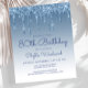 Cette invitation branchée à l'anniversaire comporte une bordure brillante bleue fausse parties scintillant et un arrière - plan bleu sombre. L'année d'anniversaire et le nom de l'invité d'honneur apparaissent dans le script d'écriture décontracté bleu, avec le reste du texte personnalisable en bleu sans serif police. La même conception de goutte de parties scintillant bleue apparaît à l'envers.