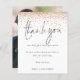Parties scintillant d'or Confetti Script Photo Mariage Merci. Un prix économique PETIT 4,5 po x 5,6 po alternatif. Disponible dans un STOCK SEMI-GLOSS 110 lb CARD qui est l'option par défaut (plus épais pour les invitations), OU un STOCK SATIN FINISH 80 lb THINNER PAPER (idéal pour les boîtiers). Les enveloppes sont en option et légèrement plus grandes que la taille de la carte. Un script de style d'écriture manuscrite pour le Merci. Sur le dos, remplacez l'exemple de photo par votre préféré de la journée comme souvenir pour vos invités. Personnalisez facilement le reste du texte avec votre message et vos noms.