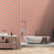 This wallpaper features ivory and aqua floral medallion motifs arranged in a diamond grid over a deep raspberry red background. The ornamental repeat pattern blends vintage style with boho charm, bringing bold color and rhythmic detail to your space. Perfect for creating a vibrant statement wall or a richly layered room with a collected, eclectic vibe. Pairs beautifully with natural woods, linens, and neutral or jewel-toned accents.