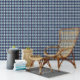 Ce papier peint festif présente des diamants de style Jacquard en motif bleu clair et foncé avec des accents de ligne dorée.