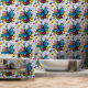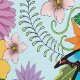 Dragon bleu et noir aux ailes papillon niché au milieu d'un bouquet de fleurs colorées sur fond de bleu clair.