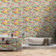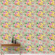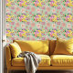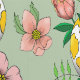 Un Python albino jaune se déplace autour de roses roses et pêche dans un arrière-plan turquoise.
