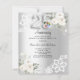Pour un 25ème anniversaire de mariage élégant et romantique. Un faux arrière - plan argenté décoré de fleurs blanches, de roses et de dentelle blanche. Personnalisez et ajoutez votre photo, vos noms et vos détails. Le numéro 25 est écrit avec une police de type fausse ballons d'argent. 1 feuille = 1 invite imprimé bord à bord.
