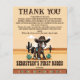 Premier Rodeo mignon cowboy bébé cheval fête d'anniversaire carte de remerciements, adorable cheval de bébé marron dans un casquette cowboys et décoré selle sur le paysage de l'Arizona pour cowboys western fête d'anniversaire thème.