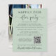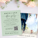 Un salon vert sage et économique ou un faire-part mariage privé et une réception de mariage ou de fête de célébration. L'avant présente "Happily Ever After Party" en typographie simple et un script élégant avec des swashes, et vous pouvez customiser votre message et l'invitation plus en détail, entrer votre URL de site mariage pour créer un code QR pour vos invités à scanner pour plus d'informations et à RSVP en ligne, et ajouter vos noms dans un script signature. Au verso, vous trouverez votre photo de mariage préférée, vos prénoms et votre date de mariage.
