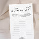 Qui suis-je est simple et amusant jeu de douche nuptiale. Écrivez votre mémoire préférée que vous avez avec la mariée. Ils seront lus à haute voix et les futurs mariés devront deviner qui est la mémoire ! Si elle ne peut pas deviner que c'était à vous, vous gagnez !