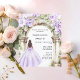 Une grande arche en marbre décorée de lavande aux fleurs violettes. Une fille avec une robe couleur lavande. Personnalisez et ajoutez un nom et des détails. 1 feuille = 1 invite imprimé bord à bord.