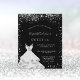 Une invitation moderne, élégante et glamour pour une Sweet 16, fête d'anniversaire des 16 ans. Un fond noir chic avec de fausses paillettes argentées et une robe. Le nom est écrit avec un style de lettrage manuscrit moderne. Personnalisez et ajoutez les détails de votre fête.