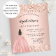 Une invitation moderne, élégante et glamour pour une fête d'anniversaire du 18ème (ou tout âge). Un arrière - plan rose en or avec de la poussière de parties scintillant en faux or, une fille portant une robe de bal. Le nom est écrit avec un script de style moderne écrit à la main. Personnalisez et ajoutez les détails de votre fête. 1 feuille = 1 invite imprimé bord à bord.
