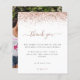 Parties scintillant d'or rose Photo Hen Party Merci. Un prix économique PETIT 4,5 po x 5,6 po alternatif. Disponible dans un STOCK SEMI-GLOSS 110 lb CARD qui est l'option par défaut (plus épais pour les invitations), OU un STOCK SATIN FINISH 80 lb THINNER PAPER (idéal pour les boîtiers). Les enveloppes sont en option et légèrement plus grandes que la taille de la carte. Une bordure de parties scintillant en or rose est en haut, et le Merci est dans un script de style manuscrit en rose poussiéreux. Personnalisez facilement le texte à vos propres détails. Sur le dos, changez votre photo préférée de votre poule en orientation portrait.