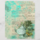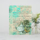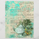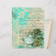 Joli collage vintage avec une illustration de théière teintée de menthe, ornée de feuillage et d'un papillon vert sur un fond d'éphémères en aqua pastel en détresse