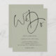 Script Nous Faisons Pale Sage Vert Faire-part de mariage. Un prix économique PETIT 4,5 po x 5,6 po alternatif. Disponible dans un STOCK SEMI-GLOSS 110 lb CARD qui est l'option par défaut (plus épais pour les invitations), OU un STOCK SATIN FINISH 80 lb THINNER PAPER (idéal pour les boîtiers). Les enveloppes sont en option et légèrement plus grandes que la taille de la carte. Un design typographique simple mais élégant en vert sauge clair. Les enveloppes sont en option. Script stylish set We Do prend le devant de la scène.Le reste du texte que vous pouvez facilement personnaliser. Les couleurs du texte et de l'arrière - plan peuvent être modifiées si vous souhaitez mieux convenir à votre thème mariage via l'option customiser plus loin.