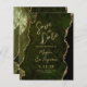 Ce mariage élégant sauvegarder la carte date dispose d'une image arrière - plan d'agate d'aquarelle verte d'olive taillée avec parties scintillant en faux or. Le texte personnalisable combine écriture manuscrite moderne couleur or, cuivre et polices italiques. L'envers présente un design coordonné d'agate vert olive et or.