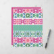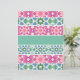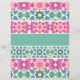 Une série de motifs géométriques colorés forme un design symétrique, qui rappelle l'oeuvre traditionnelle en tuiles. Chaque bande présente une couleur dominante, comme le rose, le bleu ou le vert, avec des textures d'aquarelle, créant une composition visuellement harmonieuse.