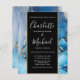 Doté de noms de style signature, cet élégant faire-part de mariage budget peut être personnalisé avec vos informations en lettres chic sur une bande noire et or et un arrière - plan agate bleu. Conçu par Thisisnotme©
