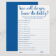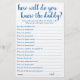 "Connais-Tu Bien Papa ?" Qui connaît le mieux le futur père ? Un simple baby shower de gardien ou de genre révèle un jeu de fête avec un script amusant et décontracté écrit à la main. Le design classique comprend une superposition de la typographie de citation à la main moderne. Pour d'autres couleurs ou produits correspondants, veuillez visiter le magasin JustFharryn Zazzle, ou contacter le concepteur, c/o Fharryn@yahoo.com Tous droits réservés. #bohochic #zazzlemade"