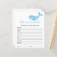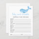 Un petit en chemin avec cette invitation au baby shower sur le thème de la mer, avec baleine à bébé dans des aquarelles bleu doux. Réponses : CRAVINGS, PLEIN, PACIFICATEUR, BOUTEILLE, LUMIÈRE NOCTURNE, LULLABY, STROLLER, ÉPIDURAL, BRÛLE, CHAISE HAUTE, SAC DE DIAPER, ÉPONSE
