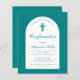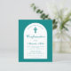 Une invitation à la confirmation moderne pour un garçon. Sur l'arrière - plan bleu turquoise, il a une arche blanche avec du texte turquoise à l'intérieur. L'occasion et le nom sont écrits dans un élégant script calligraphique ; la première ligne est du texte arché.
