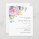 Un arrière - plan blanc. Décoré de violet, de fleurs violettes, de fleurs roses et de feuilles d'eucalyptus vert aquarellés, de sprigs, de verdure et d'un faux sprigs d'or. Personnalisez et ajoutez vos noms et détails. Retour : ajoutez l'url de votre site Web mariage au code QR pour plus de détails et/ou RSVP. 1 feuille = 1 invitation imprimé bord à bord.