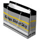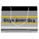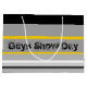 Stilvolle moderne Papiergeschenktasche mit Griffen mit Streifenprint. Der graue, gelbe und weiße Hintergrund der Holzkohle kann auf eine beliebige Farbe umgeschaltet werden, um dem Event zu entsprechen. Logo kann hinzugefügt werden, um noch mehr personalisieren zu können. Text kann personalisiert sein, oder Text kann entfernt werden.