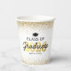 Personalisierte Graduiertenparty-Papiertassen mit einem Graduiertencap, 2023 in Imitaten Goldfolie, Schulname, elegante Golden Glitzer Kanten und das Wort Graduate in einem Skript-Schriftart.