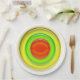 Blasen in Gelb, Grün und Rot setzen sich in der Mitte des Tellers aufeinander. Formen sehen dreidimensional aus, mit Highlights und Schatten.