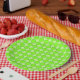 Grüne Punkte bedecken den Teller. Drei dimensionale grüne Punkte wiederholten sich mehrmals vor einem hellgrünen Hintergrund. ***Teil des koordinierten Set - BKM1T.