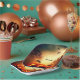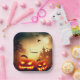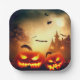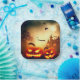 Die Szene ist Set in einem dunklen Wald mit Vollmond im Hintergrund. Der Hauptfokus des Bildes sind zwei große Jack-o-Laternen mit bösem Grinsen, die auf dem Boden sitzen, mit toten Blätter, die um sie herum verstreut sind. Im Hintergrund befindet sich eine Spuk Burg, die von Fledermäusen umringt wird. Das Farbschema des Bildes ist vorwiegend orange und schwarz. Dieses Design ist perfekt für alle Fans von Halloween.