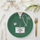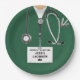 Kreative Doktor-Party-Teller für Medizinstudenten mit grünem Krankenhauspeeling, Stethoskop und lustigem Schweizer Armeemesser. Bearbeiten Sie den Text, um den Namen des Arztes hinzuzufügen.