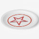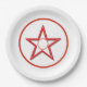 Roter Stern in drei Dimensionen, sitzt in der Mitte des Tellers. Der Stern hat einen hellroten Kreis, der sich im Inneren befindet, und der dunklere rote Kreis verläuft um den äußeren Rand der Platte herum.