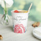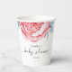 Papiertasse für eine Babydusche mit zauberhaften Aquarellbäumen, sanften rosa Blume und smaragdgrünen Blätter.