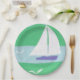 Dieser PapierTeller ist mit einer Papierkunstbeschreibung eines weißen Segelboots auf einem Fluss vor grünen Bergen entworfen.